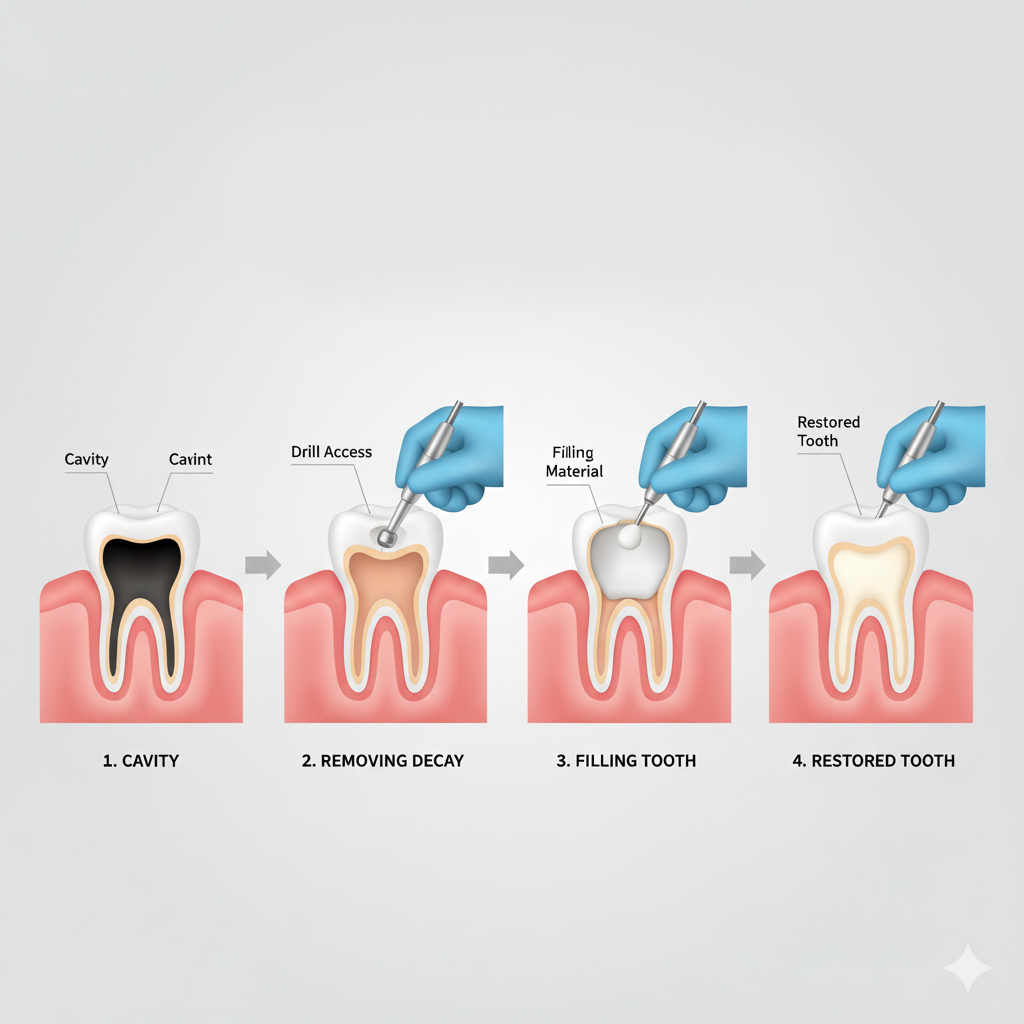 Our dentists suggest fillings to treat cavities. From a dental drill to remove the decayed tissue to filling to replace the part of the tooth that has decayed comes under this process.